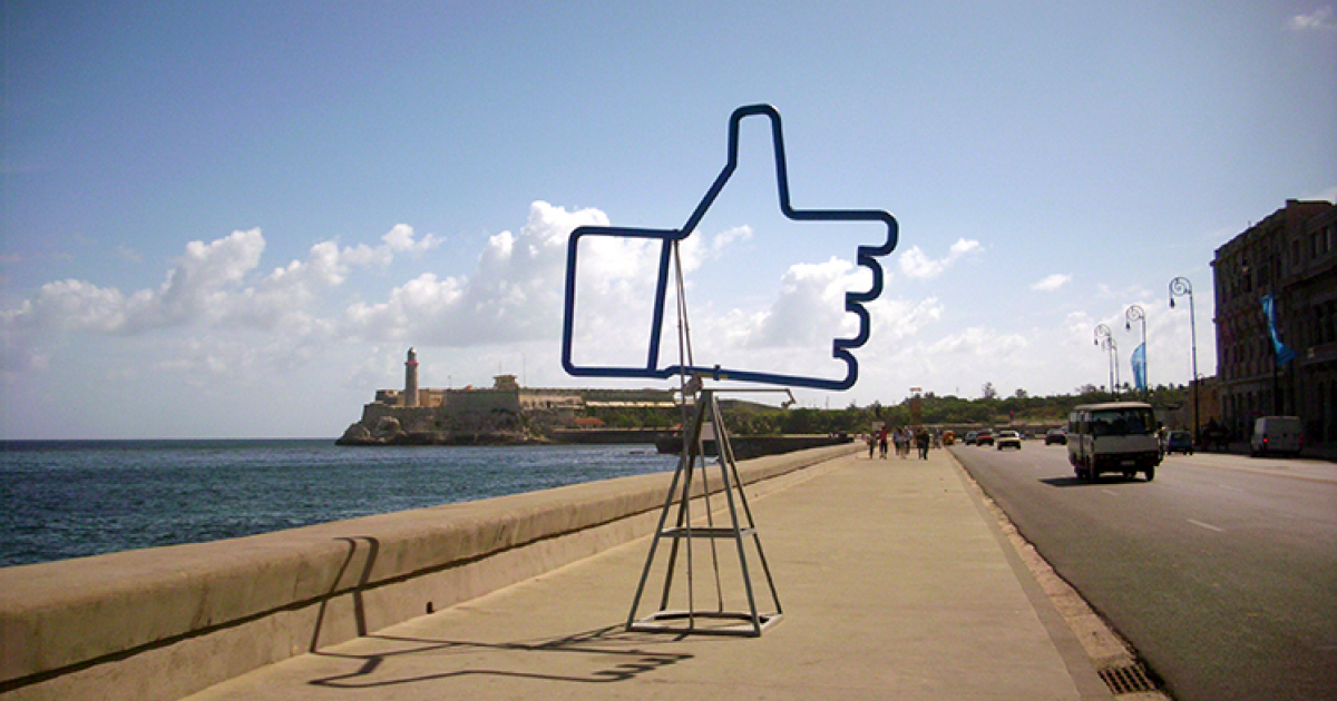 Malecón habanero el consabido icono ¨me gusta¨ de Facebook (la mano con el pulgar levantado) hecho en una estructura de madera móvil que se recubrirá con espejos.