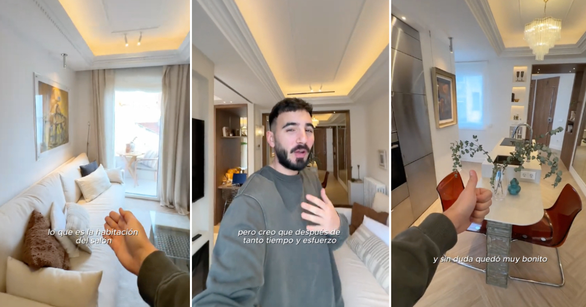 El video, de poco más de dos minutos, comienza con la entrada principal y continúa con el baño, la cocina, el salón y las habitaciones. El creador destacó varios detalles de diseño y aprovechamiento del espacio: “Los cristales de la ducha son de suelo a techo y quedaron empotrados justamente arriba”, dijo, añadiendo que el mueble del baño fue hecho a medida “con un espejo hasta arriba”.