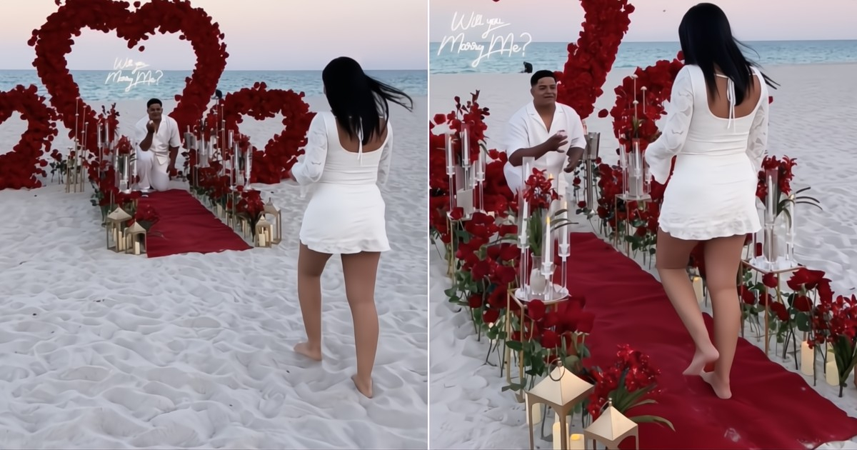 La propuesta de matrimonio fue un evento romántico en la playa, donde el joven venezolano, vestido de blanco, esperó de rodillas al final de una alfombra roja rodeada de velas y estructuras en forma de corazón decoradas con rosas rojas. La novia cubana, también vestida de blanco, caminó descalza sobre la arena hacia él, sin imaginar la sorpresa que le esperaba frente al mar al atardecer.