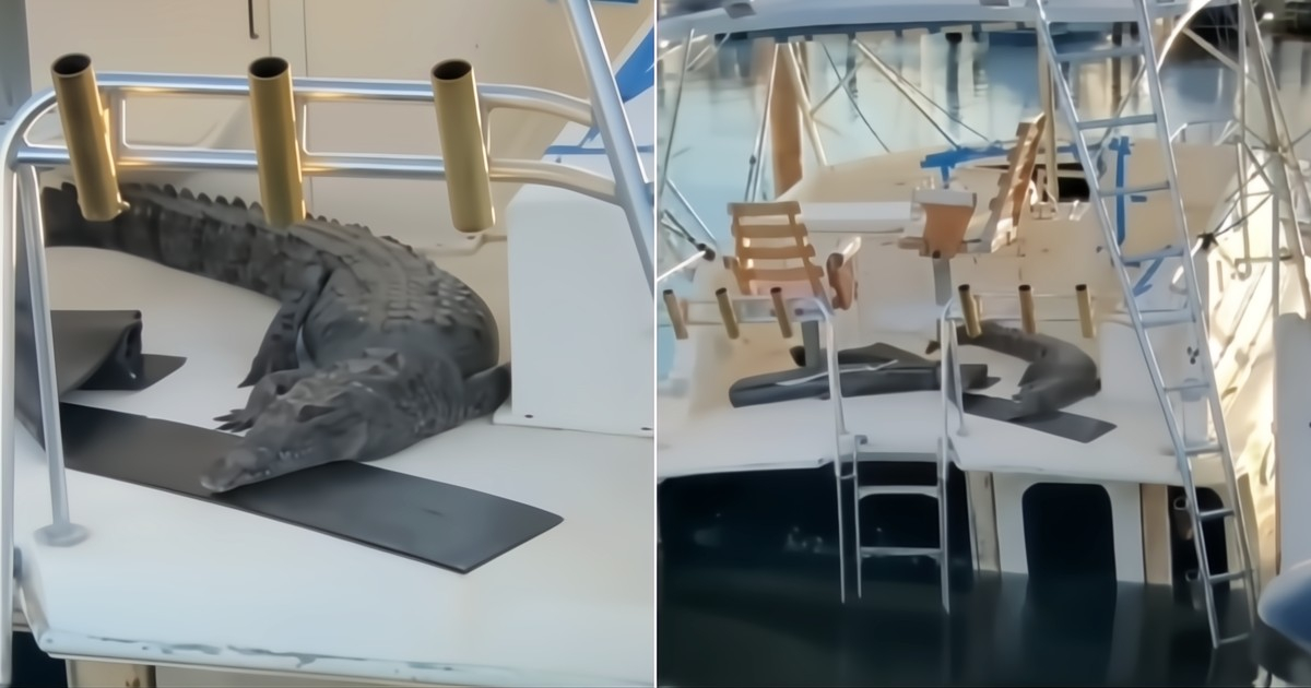 Las imágenes, compartidas en TikTok por el usuario @capitan.alejandro, muestran al reptil descansando tranquilamente sobre la parte trasera de la embarcación, que aparentemente se hundió durante la madrugada.