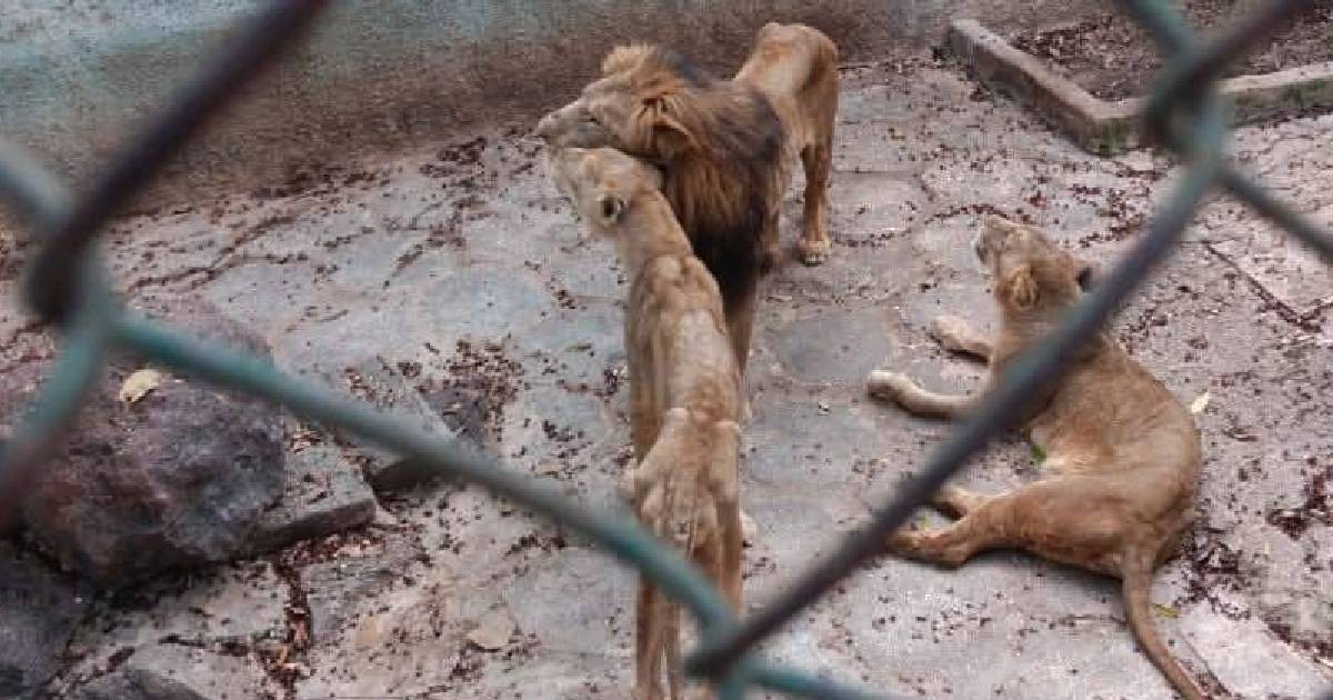 La cubana Yanaris Álvarez posteó en Facebook imágenes que muestran tres leones, incluyendo un macho adulto con melena, con las costillas y huesos visiblemente marcados y la musculatura muy atrofiada. Una de ellas los muestra tumbados sobre suelo de concreto con hojas secas esparcidas en un entorno descuidado.