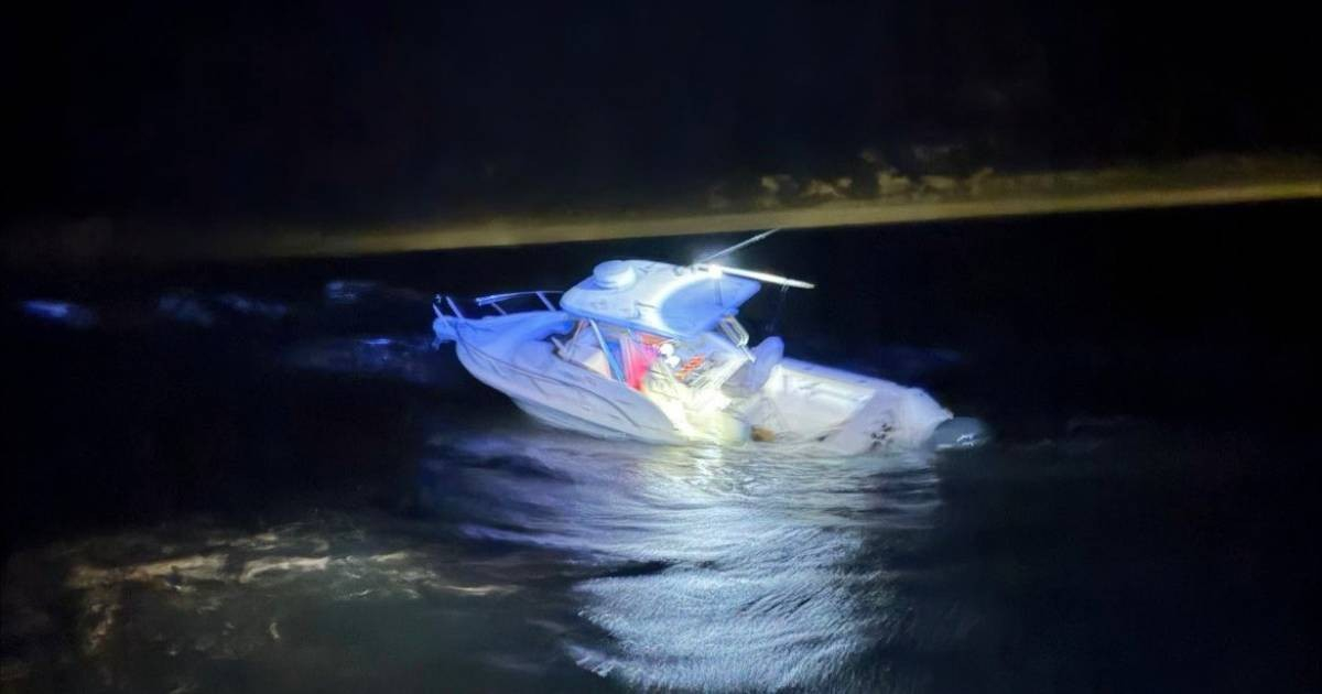 La Guardia Costera difundió imágenes que muestran al marinero rescatado —un civil con camiseta de la marca Salt Life— posando junto a cuatro guardacostas uniformados frente a una embarcación de patrulla, todo en la oscuridad de la noche.