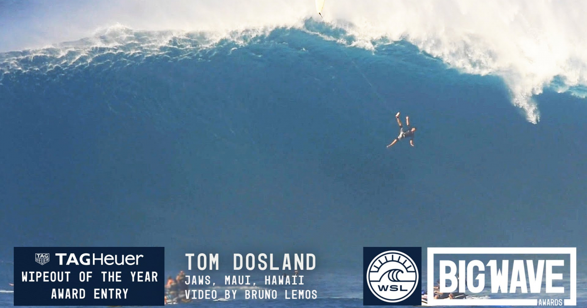 El surfista profesional Tom Dosland sufrió hoy un accidente muy aparatoso mientras trataba de surfear una ola de grandes dimensiones en Hawai. Dosland intentó “dominar” la ola gigante conocida popularmente como “mandíbula”, pero se equivocó en el cálculo y rápidamente perdió el control de su tabla. Cayó poco después desde unos diez metros de altura, hasta impactar contra el agua.