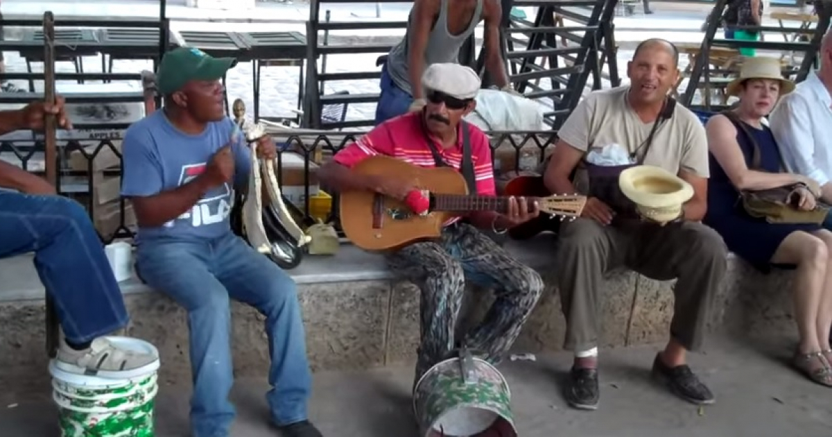 Músicos callejeros haciendo música en la Habana Vieja con algunos instrumentos improvisados